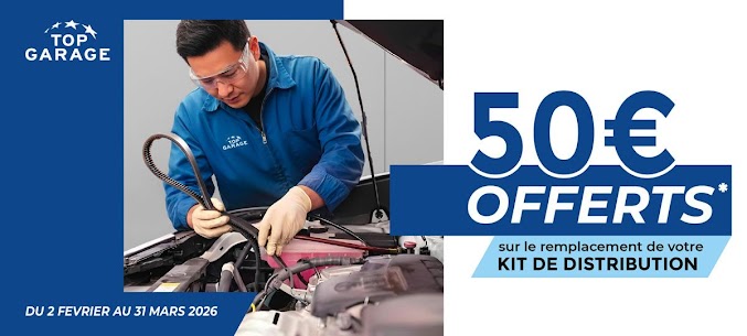 *Offre valable pour le remplacement du kit de distribution et sous réserve d’une facture globale pièces et main-d’œuvre d’un montant égal ou supérieur à 500€ TTC. Les pièces du kit de distribution sont achetées et posées dans votre atelier Top Garage.